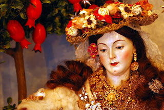 Para la ocasión estrena dos hermosas prendas, ambas donadas a nuestra preciosa Pastora, una saya bordada en oro con minucioso trabajo monjil sobre terciopelo morado fechada en el S. XVIII, así mismo el manto que la recubre es de tisú morado con tornasol en oro, ambas prendas adornan a nuestra singular Pastora Divina para estas solemnidades litúrgicas.